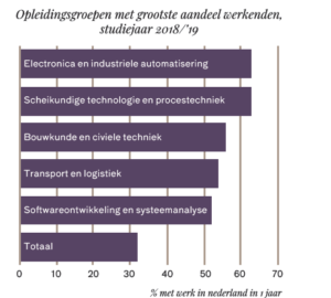 Binnen technische opleidingen is het aandeel werkenden bijzonder hoog. Zo heeft meer dan 60 procent van de internationale afgestudeerden in Scheikundige technologie en procestechniek (bijvoorbeeld Chemical Engineering) een jaar na afstuderen werk in Nederland. Dit geldt ook voor opleidingen in Elektronica en industriële automatisering. Daarnaast blijven afgestudeerden in Bouwkunde en civiele techniek, Transport en logistiek en Softwareontwikkeling en systeemanalyse met ruim 50 procent vaker in Nederland werken.