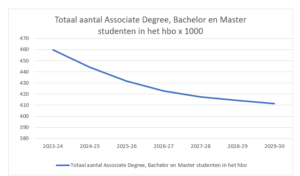 Het ministerie verwacht een verdere afname van het aantal hbo-studenten tot 2030, van 459.700 naar 409.500. Vooral het aantal voltijd-bachelorstudenten daalt, terwijl er een toename wordt verwacht bij associate-degree-opleidingen en hbo-masters. Er zijn grote verschillen tussen sectoren. Volgens de Arbeidsmarktmonitor van Zestor (2023): - **-19%** in de sector Economie - **-1%** bij Pabo-opleidingen Regionaal gezien: - Grootste krimp: Limburg (-20%) - Relatief stabiel: Noord-Holland (-5%), Utrecht (-4%)Deel dit bericht